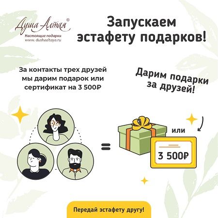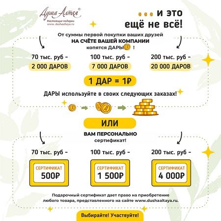 С первой покупки ваших друзей на выбор могут копиться ДАРЫ или Вам ПЕРСОНАЛЬНО мы подарим сертификат «Душа Алтая». ВЫБИРАЙТЕ! УЧАСТВУЙТЕ!