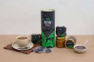 - чай авторского купажа «Сила алтайского кедра»: (состав: чай чёрный крупнолистовой высшего сорта, лист брусники, кедровый орех, трава зверобоя), 30 г;