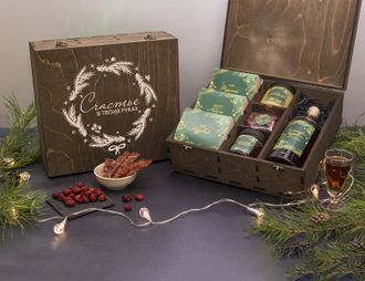 Подарочный набор «Счастье в твоих руках» в деревянном кейсе. Статусный набор в стильной деревянной коробке с чаями, сладостями и набором для настойки. Сочетание традиций, изысканности и новогоднего уюта. Солидный корпоративный подарок, который подчеркнёт вашу благодарность и внимание. Сделайте заказ и удивите партнёров безупречным вкусом!