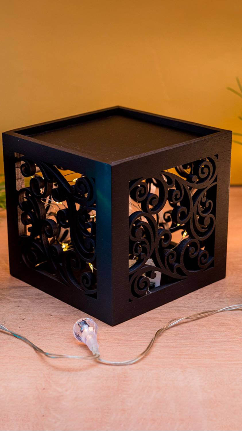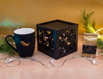 Упаковка: коробка-кубик из дерева с лазерной резкой.