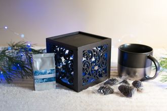 Упаковка: коробка-кубик из дерева с лазерной резкой.