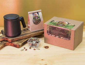 - чай авторского купажа «Сила Алтайского кедра» (состав: чай чёрный крупнолистовой высшего сорта, лист брусники, кедровый орех, трава зверобоя), 20 г;
